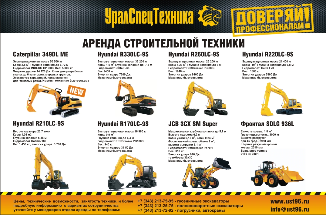 Особого внимания заслуживает предложение компании «УралСпецТехника», которая уже около 7 лет специализируется на предоставлении в аренду строительной техники и механизмов. Предприятие обладает солидным парком различных механизмов . В ее активе – 24 единицы техники, в том числе 8 гусеничных экскаваторов. Ориентируясь на запросы девелоперов, предприятие готово предложить своим постоянным и новым клиентам особые условия сотрудничества. Компания предоставляет в аренду спецтехнику по взаимозачету, в обмен на коммерческую или жилую недвижимость. Кроме того, по договору взаимозачета возможно предоставление тяжелой карьерной техники в обмен на инертные материалы.